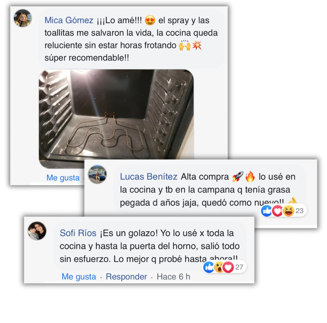 Spray: formato práctico, fórmula potente, limpia grasa incrustada en segundos, no deja rastros, resultados profesionales desde casa.